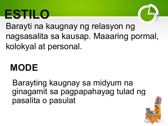 Halimbawa ang katutubong wika o pang-araw. Ang estilo ay maaaring formal kolokyal at intemeyt o personal. Maaaring formal kolokyal at intemĂȘt o personal ang estilo.