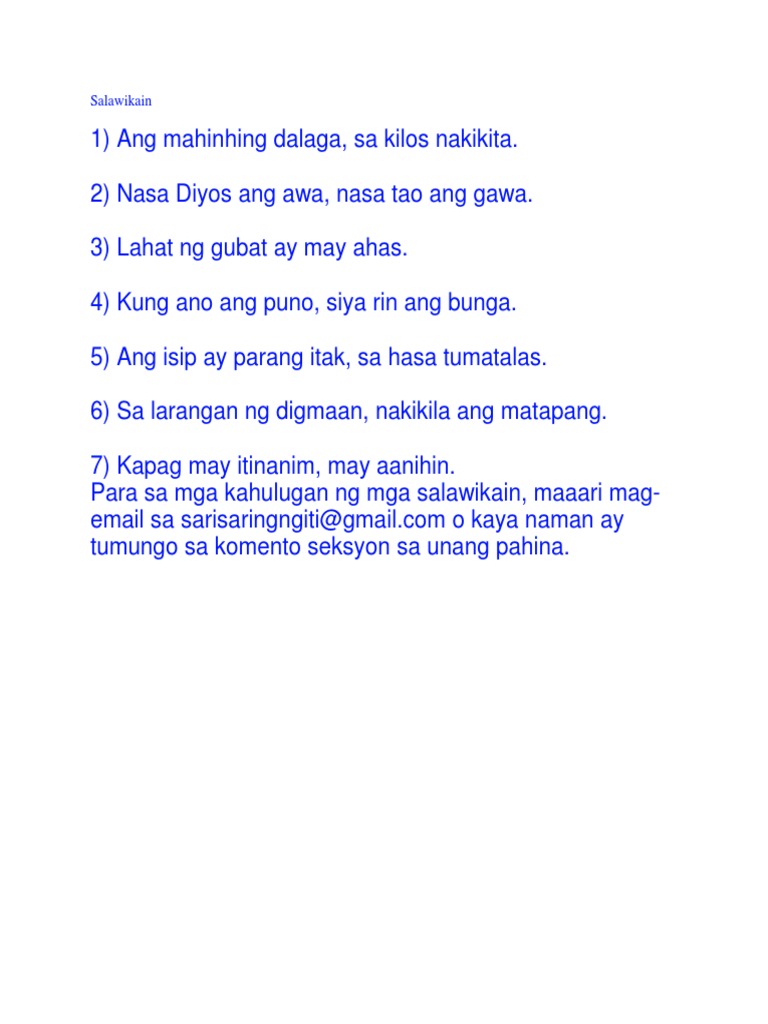 Ang maniwala sa sabi-sabi walang bait sa sarili. Susuklian ng Diyos ang lahat ng kabutihan na gagawin ng tao. Ano ibig sabihin ng Ang isip ay parang itak sa hasa tumatalas.